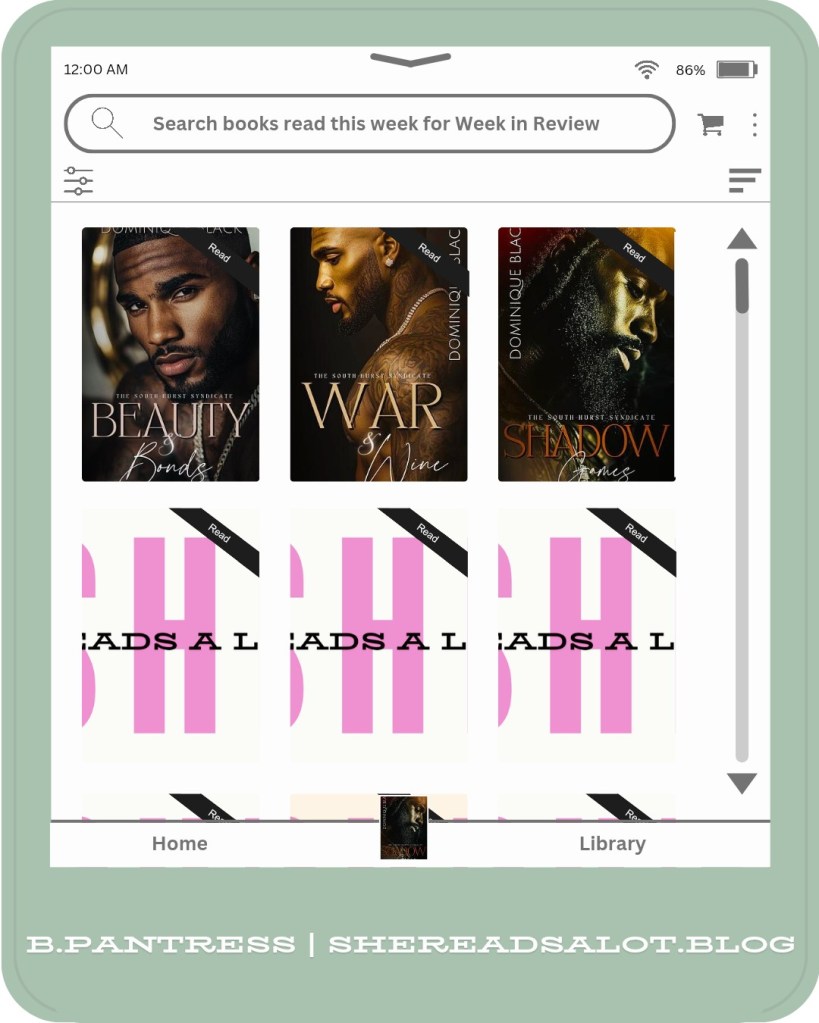 And then I got to the end of my week with the last book, Shadow Games, in Mrs. Dominique Black‘s The South-Hurst Syndicate series. About: